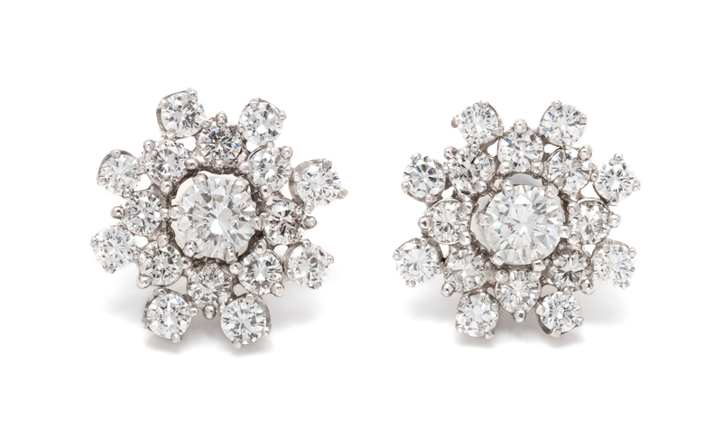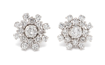 consisting of a pair of stud earrings containing two round brilliant cut diamonds weighing approximately 0.90 carat total and two cluster jackets containing 32 round brilliant cut diamonds weighing approximately 2.25 carats total.