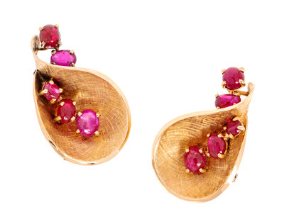 A Pair of Retro Yellow Gold and Ruby Earclips, Trabert & Hoeffer-Mauboussin, 9.40 dwts.