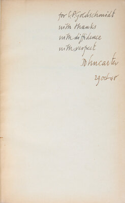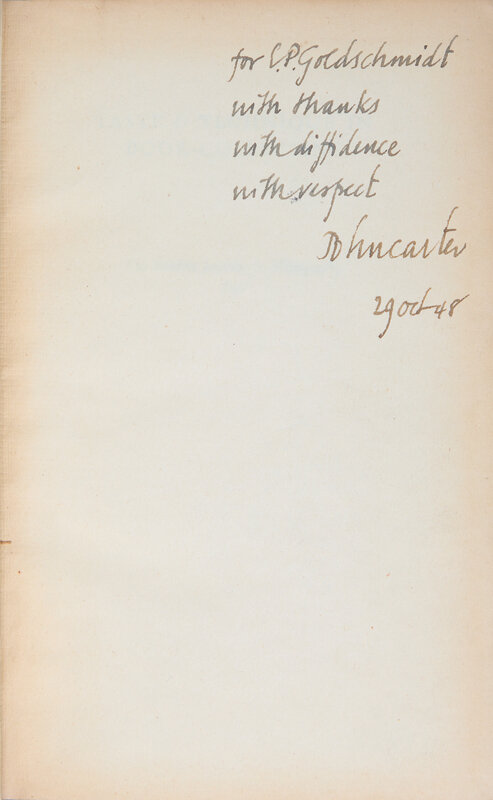 Cambridge: University Press, 1948. First edition. 8vo. (xi), 201, (1) pp. Presentation copy, inscribed on front free endpaper "for E.P. Goldschmidt with thanks with diffidence with respect John Carter 29 Oct. (19)48." Red cloth, spine stamped in gilt, boards lightly soiled, corners bumped; dust-jacket and other ephemera laid-in.