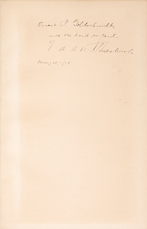 London: George Allen & Unwin, (1927). First edition. 8vo. (xv), 311 pp. Presentation copy, inscribed on front free-endpaper: "Ernest P. Goldschmidt, with the kind regards of A.S.W. Rosenbach May 18, 1928." Brown cloth, stamped in gilt, cocked, boards lightly soiled, extremities lightly worn, rear gutter starting; offsetting to prelims; separation at gutter at pp. 130-1; dust-jacket wanting.