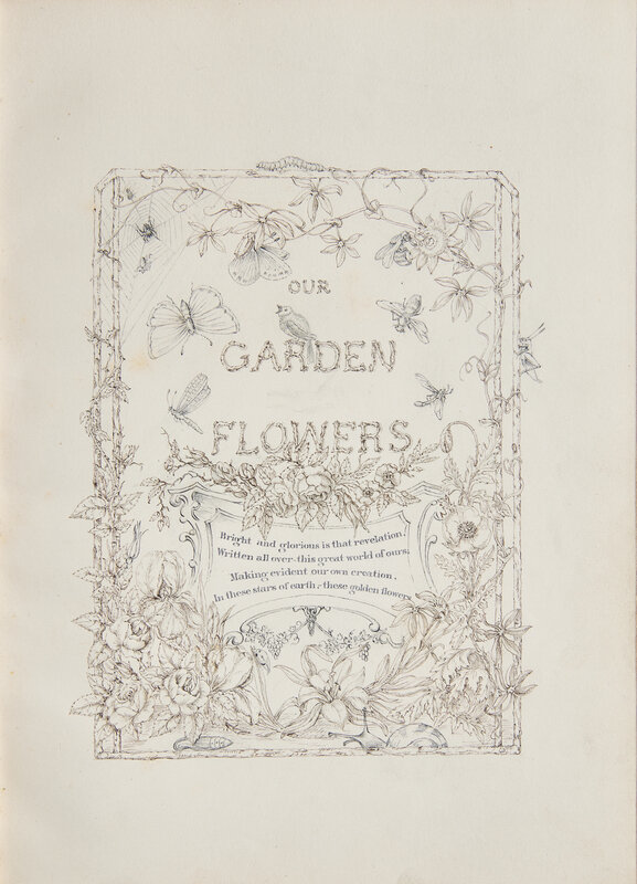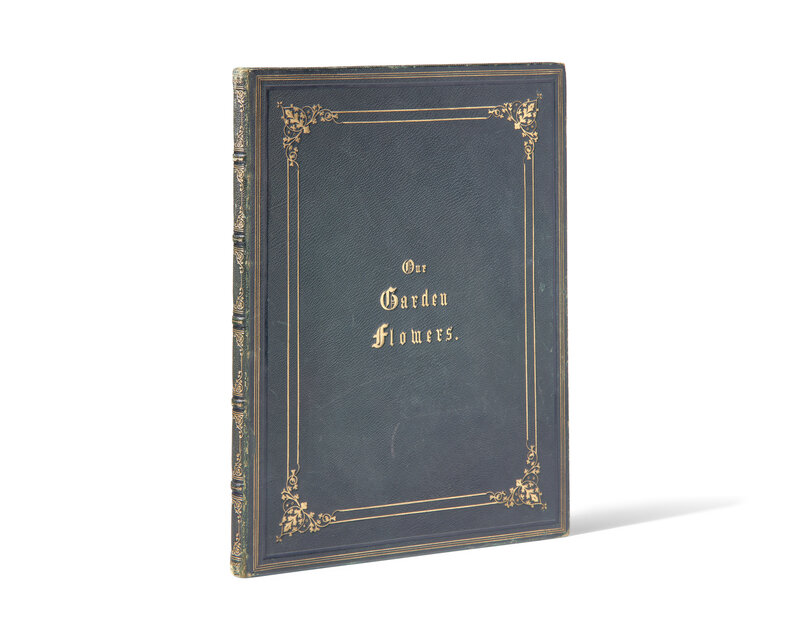 No place, no date (London, ca. mid-late 19th century). Folio. Pen and ink, pencil, and/or watercolor, on 17 leaves, rectos only. Comprising hand-drawn pictorial title-page within foliate border; four leaves of manuscript verse within foliate border; 12 full-page watercolor botanical drawings, each with manuscript at bottom in foliate lettering. Original full spruce green morocco, decorated in blind and in gilt, extremities and boards scuffed and rubbed; all edges gilt; printed moire silk endleaves; by Ackermann, 191 Regent St, London; bookseller's ticket on lower verso front free endpaper; scattered spotting; some leaves with thumb soiling.