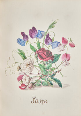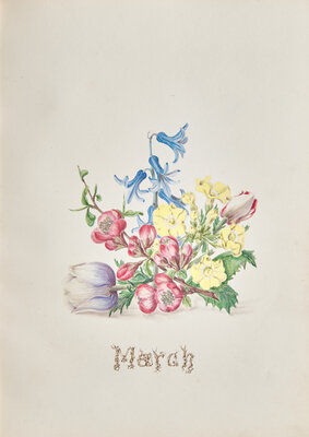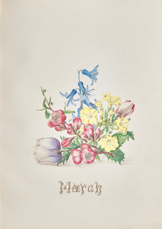 A superb and highly finished hand-drawn botanical album, arranged by season, and with each floral watercolor illustration representing one month of the year. With accompanying sectional pages for each season containing verses from poems by Henry Wordsworth Longfellow, including excerpts from Autumn (1839), An April Day (1825), and Woods in Winter (1839).