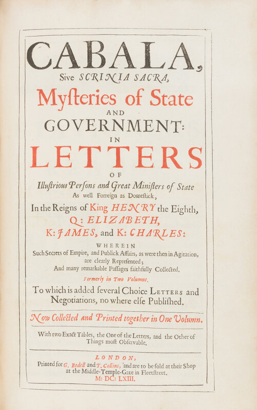 London: Printed by Thomas Newcomb, 1655. Two works in one volume, bound with Cabala, Sive Scrinia Sacra, Mysteries of State and Government in Letters...1663. Folio (305 x 203 mm). Later full calf with spine rebacked in 7 compartments with 6 raised bands, lightly worn; very light spotting throughout; armorial bookplate of Charles William Hamilton Sotheby. Lowndes, 646; Wing D1453, C13.