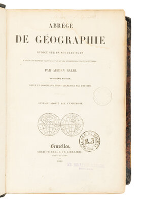 Brussels: Societe Belge de Librairie, 1840. 2 volumes in one, large 8vo. Numerous double-page maps. Contemporary deluxe? quarter calf, spine gilt-stamped and lettered; lower joint touched up, small split to front joint near foot, light rubbing to extremes; some occasional dampstaining; College St. Michel rubberstamp on title; Gonzaga University Library deaccession stamp; Pierre-Jean De Smet (1801-1873), possibly his copy?; St. Ignatius Mission, Montana, early notation on title-page; early notations on last map verso, Belgium map hand-outlined in red (possibly a route taken);