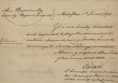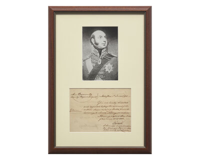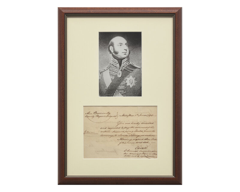 Halifax, June 1, 1798. Single sheet, approximately 5 3/4 x 8 in. (146 x 203 mm) (sight). Manuscript document, signed by Prince Edward, Duke of Kent and Strathearn ("Edward), being a pay order for twelve pounds for a James Irving. In mat with a portrait of Edward, and unexamined out of frame, 18 3/4 x 13 1/4 in. (476 x 336 mm).