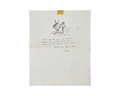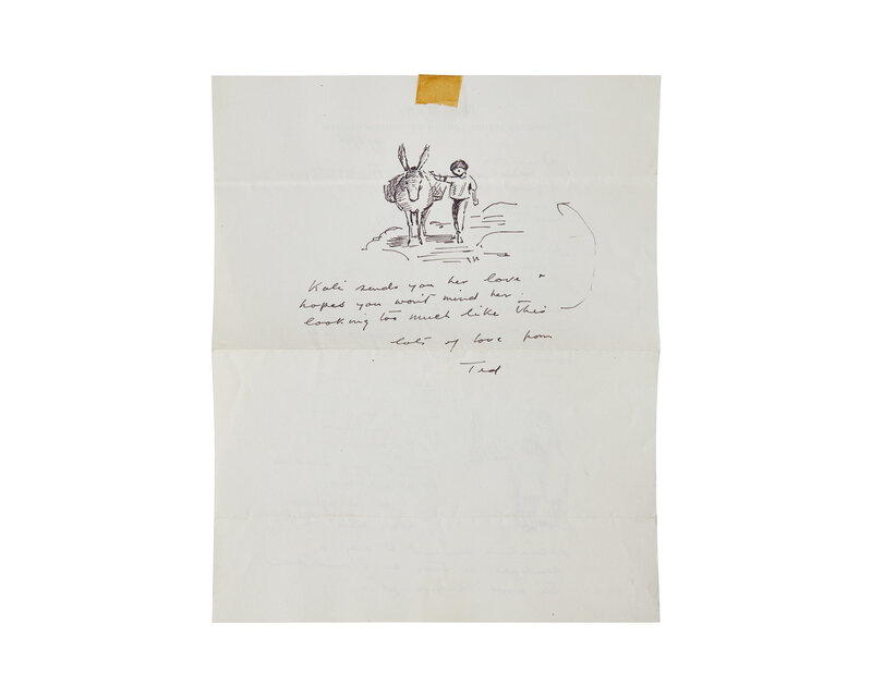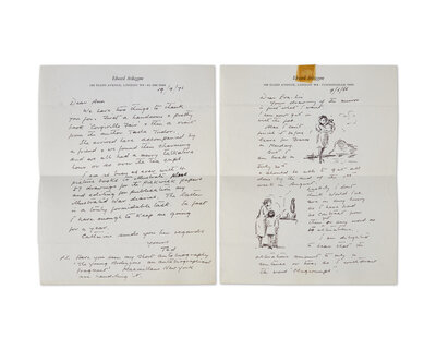 London, June 9, 1966. One sheet, 10 x 8 in. (254 x 203 mm). Two-page autograph letter, signed by Ardizzone ("Ted") on his personal stationery, to Finnish author Eva-Lis Wuorio, regarding his work on her then upcoming book Kali and the Golden Mirror (1967), and featuring three sketches within the body of the letter of images that would appear in that book's published version (including the cover image, the frontispiece, and image on p. 65). Creasing from when folded; tape residue in top edge recto and verso, but not affecting manuscript or drawings.