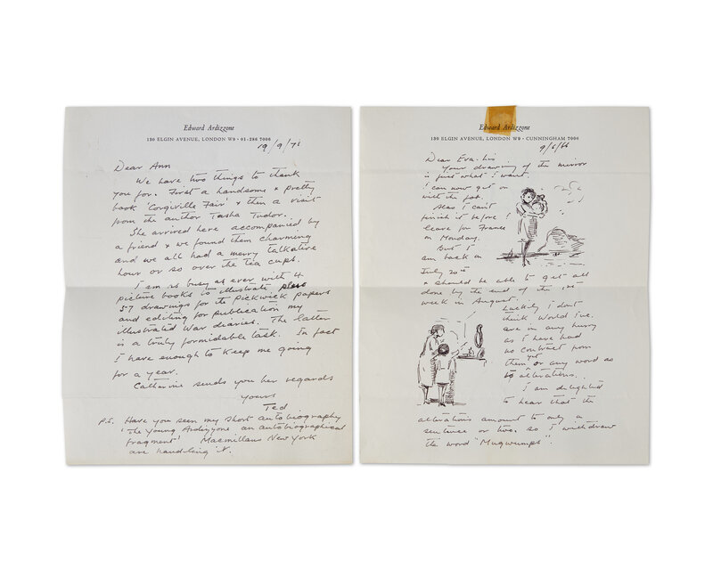 London, September 19, 1971. One sheet, 10 x 8 in. (254 x 203 mm). One-page autograph letter, signed by Ardizzone ("Ted") on his personal stationery, to Ann, regarding a recent visit by the author and illustrator Tasha Tudor, his work on "4 picture books", his illustrations for an edition of Charles Dickens's Pickwick Papers, and the editing of his war diaries, the latter a "truly formidable task". Creasing from when folded.