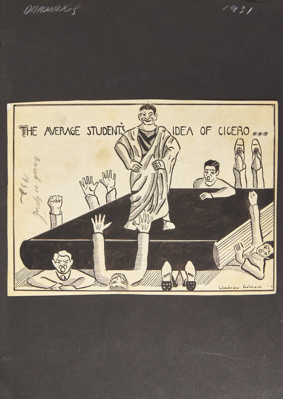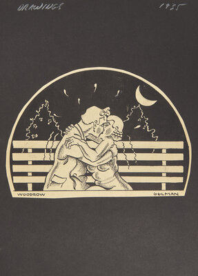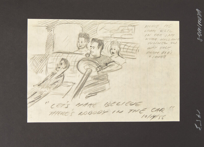 No place, ca. 1931-53. Scrapbook of comics and original sketches by American cartoonist Woody Gelman. Comprising 19 printed illustrations, in color and black and white, and over 20 original sketches, in color and black and white. Each mounted to black paper and housed in Gelman's blue cloth three-ring binder. Condition varies, although generally well-preserved.