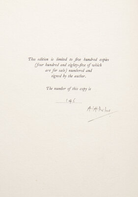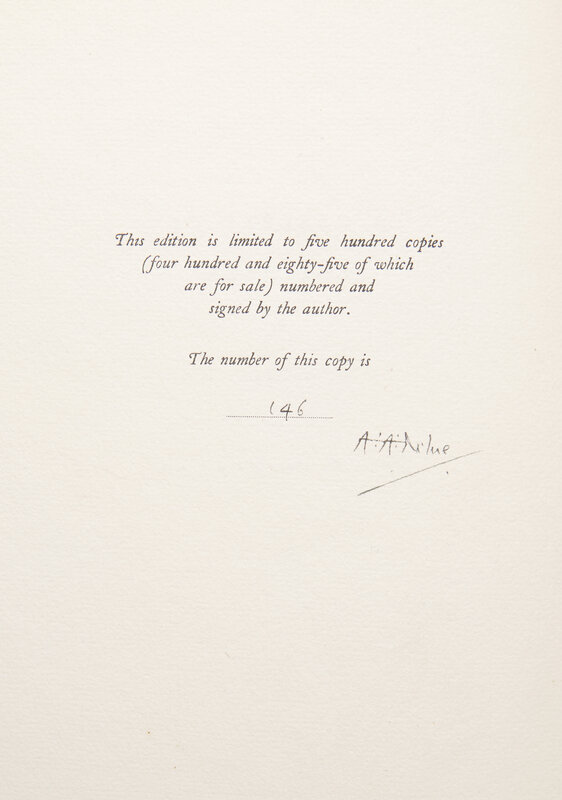 London: Stanley Paul & Co., Ltd., (1925). Limited edition, #146/485 numbered copies, signed by Milne (from a total of 500). 4to. Illustrated with 12 color plates by Saida (H. Willebeek le Mair). Publisher's white cloth-covered beveled-edge boards, decorated in gilt, boards soiled, spine darkened, library label at foot of spine; top edge gilt, other edges untrimmed; large blank label on front paste-down; library ink stamp at top of rear paste-down; gutter split at p. 75; paperclip residue in top edge of final two leaves.