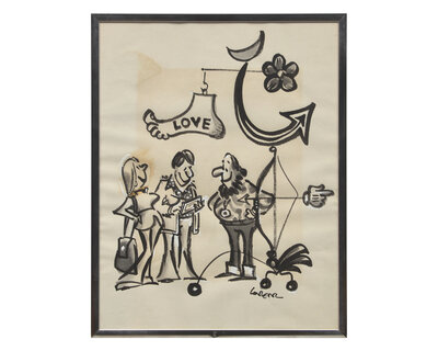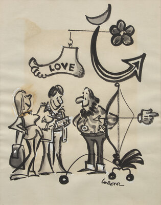 No place, ca. 1976. Ink, wash, and acrylic on paper, signed by Lorenz in bottom right ("Lorenz"). Manuscript on reverse of frame, "Drawn by Rob't Lorenz Cartoon editor N. Yorker 1976. For N.W. [Nicholas Wedge] ad." Unexamined out of frame, 14 1/2 x 11 1/2 in. (368 x 292 mm).
