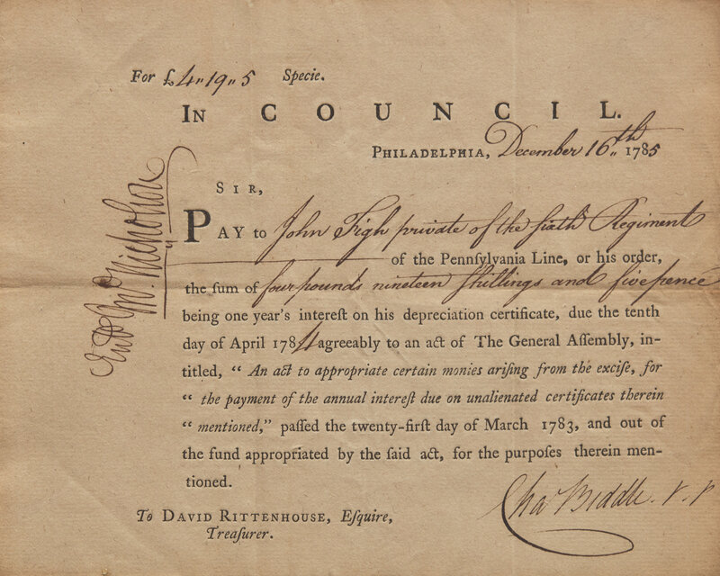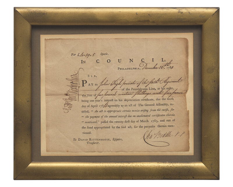 Philadelphia, December 16, 1785. Single oblong sheet, approximately 6 1/2 x 8 in. (165 x 203 mm) (sight). Partially-printed pay order, signed by Charles Biddle as Vice President of the Supreme Executive Council of Pennsylvania, requesting Treasurer David Rittenhouse to pay John Figh, private of the Sixth Regiment of the Pennsylvania Line, 419 shillings and five pence for one year's interest on his depreciation certificate; counter-signed by John Nicholson, Comptroller-general of Pennsylvania. Creasing from old folds. Unexamined out of frame, 9 1/2 x 11 1/2 in. (241 x 292 mm).