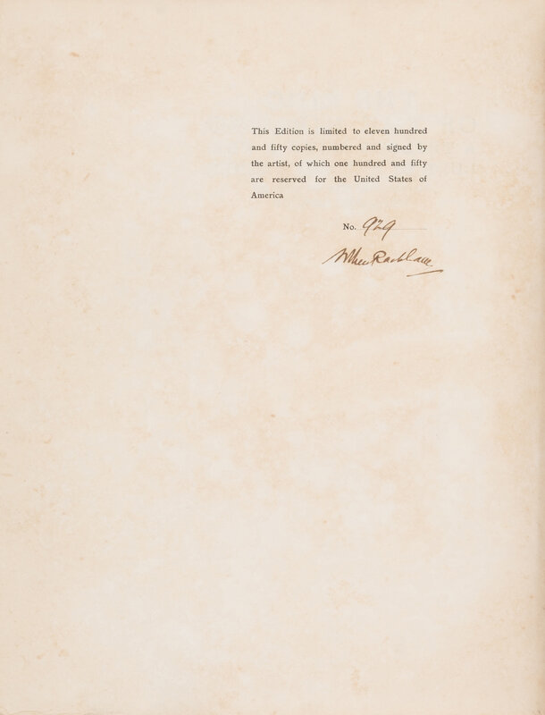 London and New York: William Heinemann and Doubleday Page & Co., 1910. First and limited edition, #929/1,150 signed by Rackham. 4to. 34 color plates, tipped in. Some spotting. Original gilt-stamped pictorial vellum, top edge gilt, others uncut extremities soiled and toned, lacking ties, few small splits near spine ends.
