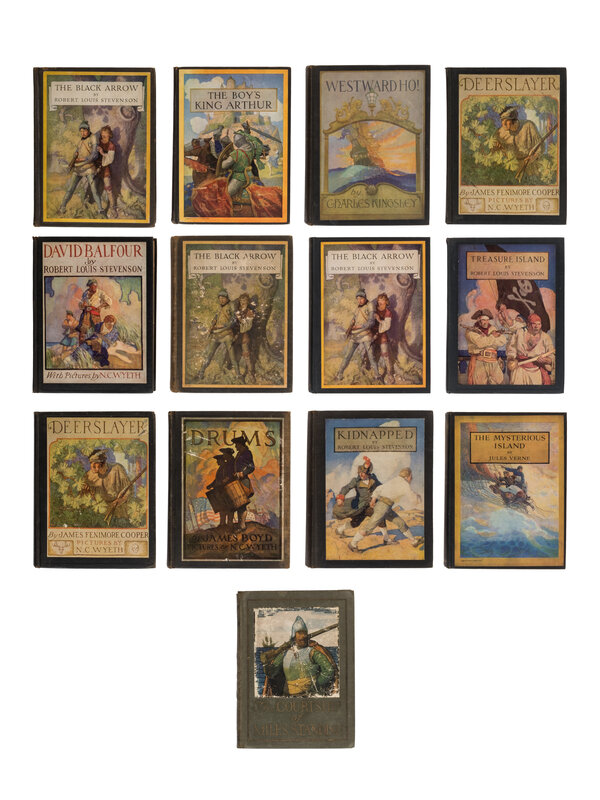 Stevenson, Robert Louis. Treasure Island. 1922. First issue with contents showing chapter XVI incorrectly at p.23; Stevenson, Robert Louis. The Black Arrow. 1927; Boyd, James. Drums. 1928; Cooper, James Fenimore. Deerslayer. 1929; Kingsley, Charles. Westward Ho! 1935; Vernre, Jules. The Mysterious Island. 1946; Lanier, Sidney. The Boy's King Arthur. 1947; And 10 others,