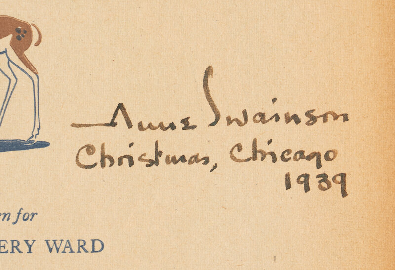 Chicago: Montgomery Ward, 1939. First edition, first issue. Small 4to. Numerous color illustrations by Denver Gillen. Title and second leaf of text detached. Original cloth-backed pictorial boards, light surface rubbing. Provenance: Ann Swainson (1888-1955), head of design at Montgomery Ward (gift inscription on title-page, dated same month as publication).