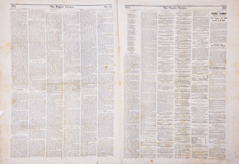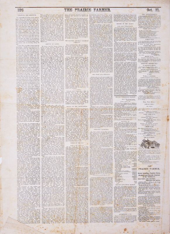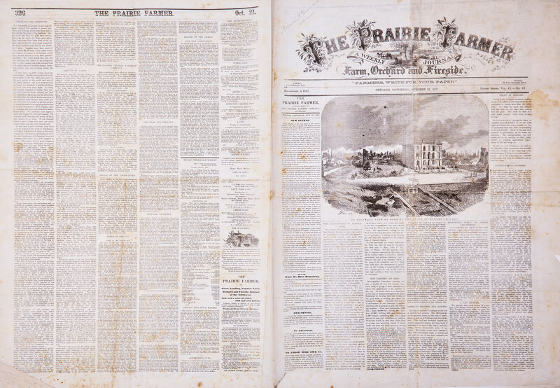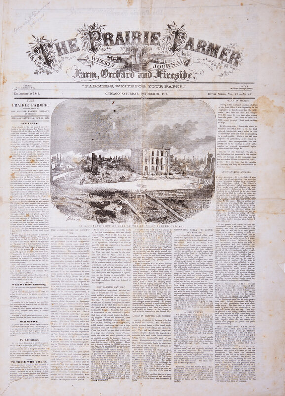 Very early--if not first the issue--post-Chicago Fire. A large front-page woodcut vignette titled "An Accurate View of Some of the Ruins of Burned Chicago." The first story is the newspaper's appeal for aid as "being situated in the very heart of the business district of the city, of course The Prairie Farmer Building, with all its offices and effects was speedily swept from existence." The text continues with such articles as "How Farmers Can Help", "Responding Nobly-to Agents and Friends", and "Delay in Mailing".