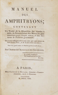 First edition of famous French gourmand Laurent Grimod de La Renyiere's (1758-1831) guide to the art of presenting food. Divided into three parts, the first deals with the slicing of meat, the second with seasonal menus, and the third on etiquette and civility while eating.