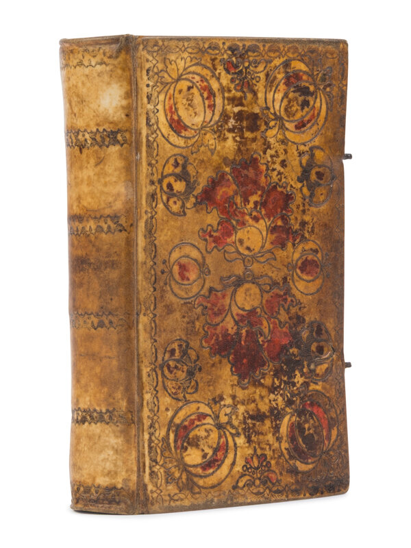 Marburg: Joh. Henrich Stocks, 1750. 8vo. Wood-engraved frontispiece. Contemporary German vellum, upper covers tooled in various floral designs, filled in with remnants of hand-painting, all edges gilt and gauffered, lacking clasps; toning throughout.; morroco book-plate of Estelle Doheny (1875-1958), prominent American book collector; prelims featuring manuscript notation related to the Kovel family, ca 1770s, in German and in English.
