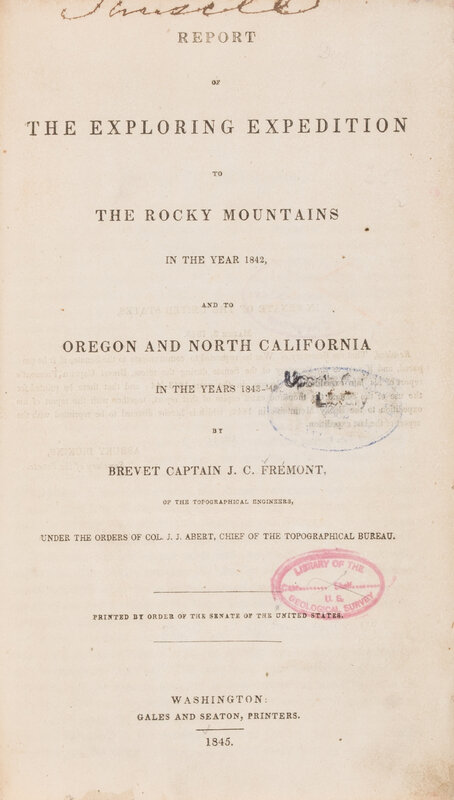 First edition, the Senate issue, with the astronomical and meteorological observations omitted from the House issue and subsequent editions. The two reports, written with the help of Fremont's wife Jessie Benton, "caught the public imagination: images of Fremont's guide, the then little-known Christopher 'Kit' Carson, riding bareback across the prairie, and Fremont himself, raising a flag on a Rocky Mountain peak, entered the national mythology" (Pamela Herr, ANB).