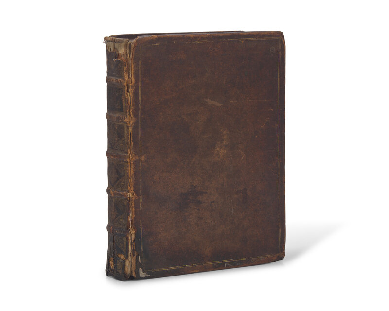 Amsterdam: Jan ten Hoorn, 1699. Four parts in one volume. First edition. 4to. (xviii), 192; (4), 128; (4), 159; (1), (4), 198 pp. Illustrated with an engraved title-page and 11 engraved plates. Full brown sheepskin, decorated in gilt, boards and extremities worn and scuffed, joints worn, loss in upper spine; top edge stained black, other edges marbled; armorial book-plate of John Douglas Lindsay on front paste-down, old ownership signature above same; loss in bottom L4, affecting text; scattered spotting to text; intermittent dampstaining in lower gutter.