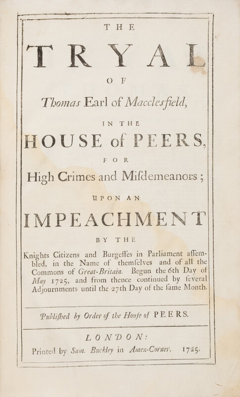 The Tryal of Thomas, Earl of Macclesfield, in the House of Peers for High Crimes and Misdemeanors.