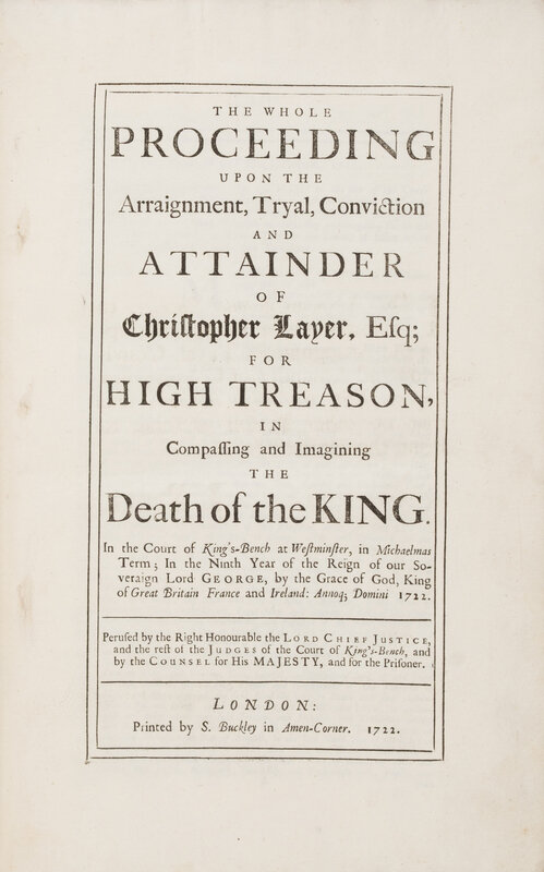 The Whole Proceeding Upon the Arraignment, Tryal, Conviction, and Attainder of Christopher Layer, Esq., for High Treason in Compassing and Imagining the Death of the King.