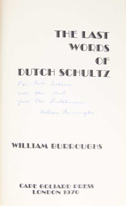 London: Cape Goliard Press, 1970. First edition. Presentation copy, inscribed by Burroughs on title-page: "For Bob Wilson, all the best, from the Dutchman William Burroughs". Tall 8vo. Illustrated by R.B. Kitaj. Original blue cloth, stamped in red; in original pictorial dust-jacket.