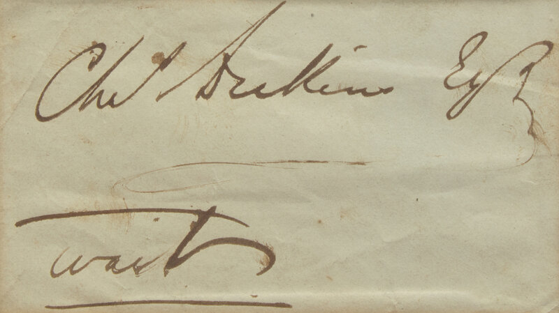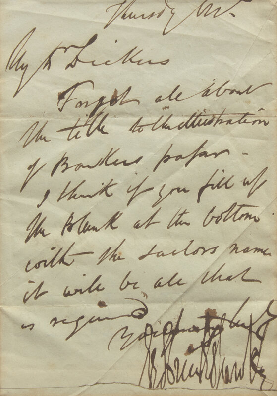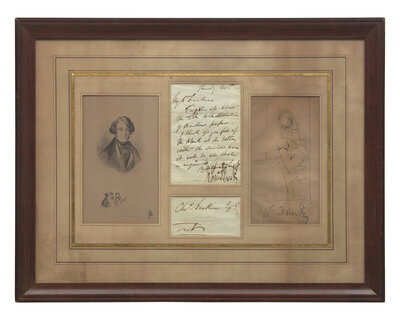 No place, "Thursday", no year. Single-sheet, approximately 6 1/2 x 4 1/2 in. (165 x 114 mm) (sight). One-page autograph letter, signed by George Cruikshank to Charles Dickens: "My Dear Dickens Forgot all about the title to the illustration of Bankers paper--I think if you fill up the Blank at the bottom with the sailors name it will be all that is required. Yours respectfully George Cruikshank". With mailing envelope, addressed by Cruikshank. In mat with an engraved portraits of Dickens and Cruikshank, and unexamined out of frame, 17 3/4 x 23 in. (451 x 584 mm).