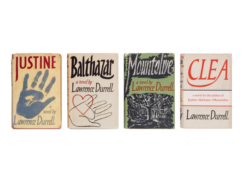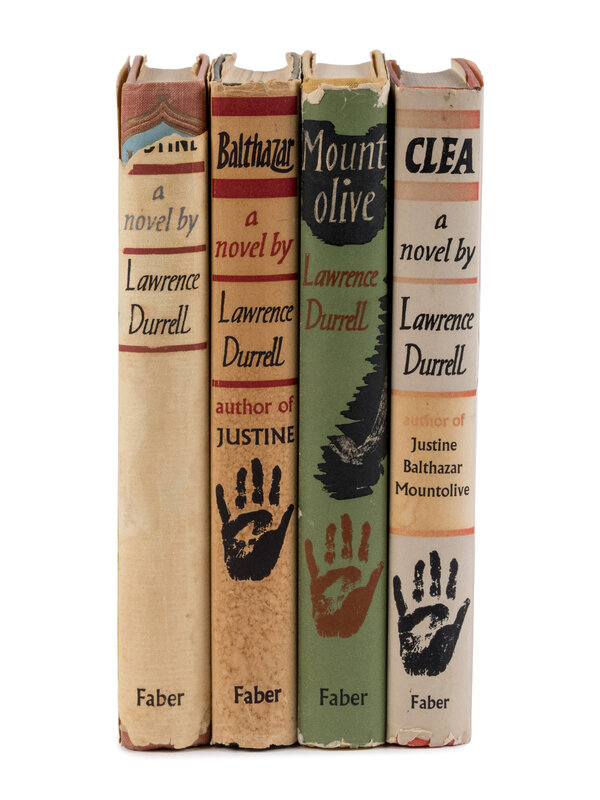 Including: Justine. 1957. -- Balthazar. 1958. -- Mountolive. 1958. -- Clea. 1960. London: Faber and Faber. 4 volumes, 8vo. First editions Original cloth (Balthazar spine toned and covers rubbed); dust jackets (Justine spine chipped with loss near top of spine, tape repairs to verso, light edgewear to others).