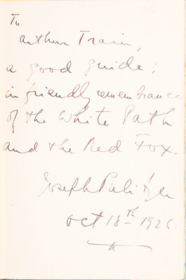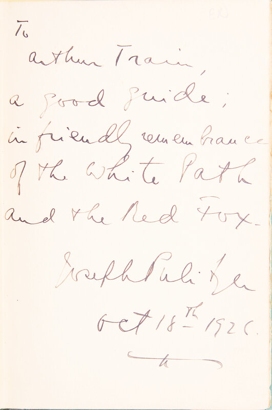 Boston: American Unitarian Association, (1899). First edition. Presentation copy, inscribed by Joseph Pulitzer to Arthur Train: "To Arthur Train, a good guide; in friendly remembrance of the White Path and the Red Fox-Joseph Pulitzer Oct 18th 1926". 12mo. (vi), 72 pp. Publisher's green cloth, stamped in dark green and in gilt, light rubbing to joints, small piece of paper adhered to rear board.