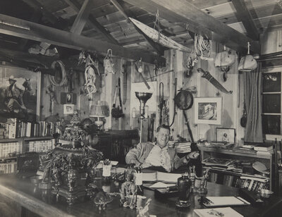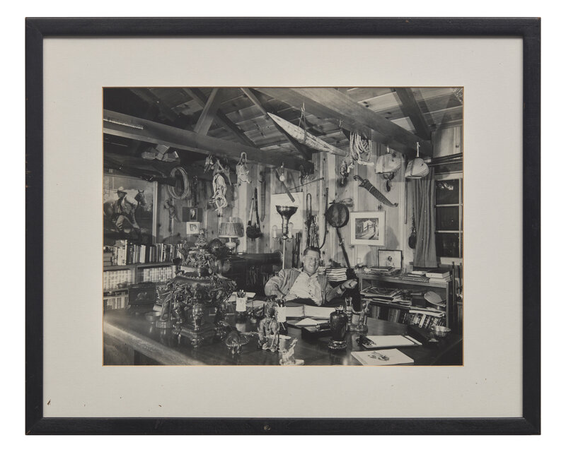 No place, no date. Photograph of Erle Stanley Gardner in his study. Approximately 11 1/2 x 15 in. (292 x 381 mm) (sight). Mounted to board. In mat and in frame, 17 1/4 x 21 1/8 in. (438 x 536 mm).