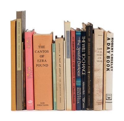 Adair, Virginia Hamilton. Ants on the Melon: A Collection of Poems. New York: Random House, 1996; Ammons, Archibald Randolph. Tape for the Turn of the Year. Ithica: Cornell University Press, 1965. Signed by Ammons; Ammons, Archibald Randolph. Six-Piece Suite. [Winston-Salem, NC]: Palaemon Press Limited, 1978. Limited edition, #89/230 copies, signed by Ammons; Ammons, Archibald Randolph. Changing Things. [Winston-Salem, NC]: Palaemon Press Limited, 1978. Limited edition, #5/126 copies, signed by Ammons; Bukowski, Charles. At Terror Street and Agony Way. Los Angeles: Black Sparrow Press, 1968. Limited edition, one 800 copies in wrappers; Creeley, Robert. A Day Book. New York: Charles Scribner's Sons, 1972; Lifhsin, Lyn. Museum. Albany: The Conspiracy Press, 1973; Momday, N. Scott. In the Presence of the Sun. Santa Fe: The Rydal Press, 1992. Limited edition, letter "U" of 26 numbered copies, signed by Momday; Nin, Anais. Paris Revisited. Santa Barbara: Capra Press, 1972. Limited edition, #146/250 copies signed by Nin; Pound, Ezra. The Cantos. New York: New Directions, 1970; Rich, Adrienne. The Will to Change: Poems 1968-1970. New York: W.W. Norton & Company, Inc., 1971; Rukeyser, Muriel. The Speed of Darkness. New York: Random House, 1968. -- Schwartz, Delmore. In Dreams Begin Responsibilities. Norfolk, CT: New Directions, 1938. -- Shepard, Sam. Hawk Moon. Santa Barbara: Black Sparrow Press, 1973. Limited edition, #141/200 numbered copies, signed by Shepard; Simic, Charles. Somewhere Among Us A Stone is Taking Notes. San Francisco: Kayak, 1969; Tilghman, Christopher. On the Rivershore. New York: Farrar, Straus, & Giroux, 1990. Signed by Tilghman; Wilbur, Richard. Seed Leaves. Boston: David R. Godine, 1972. Limited edition, #116/160 copies, signed by Wilbur and artist Charles Wadsworth; Zukovsky, Louis. A Test of Poetry. Brooklyn: The Objectivist Press, 1948.