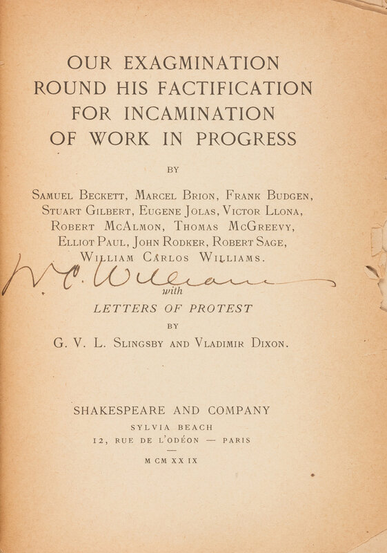 Paris: Imprimerie Durand for Sylvia Beach at Shakespeare and Company, 1929. First edition, signed by Williams on title-page. 8vo. (Marginal toning as usual, half-title and title-page brittle with chipping, contents leaf and following leaf loose). Modern calf; original rear wrapper bound in at end. Wallace B11.