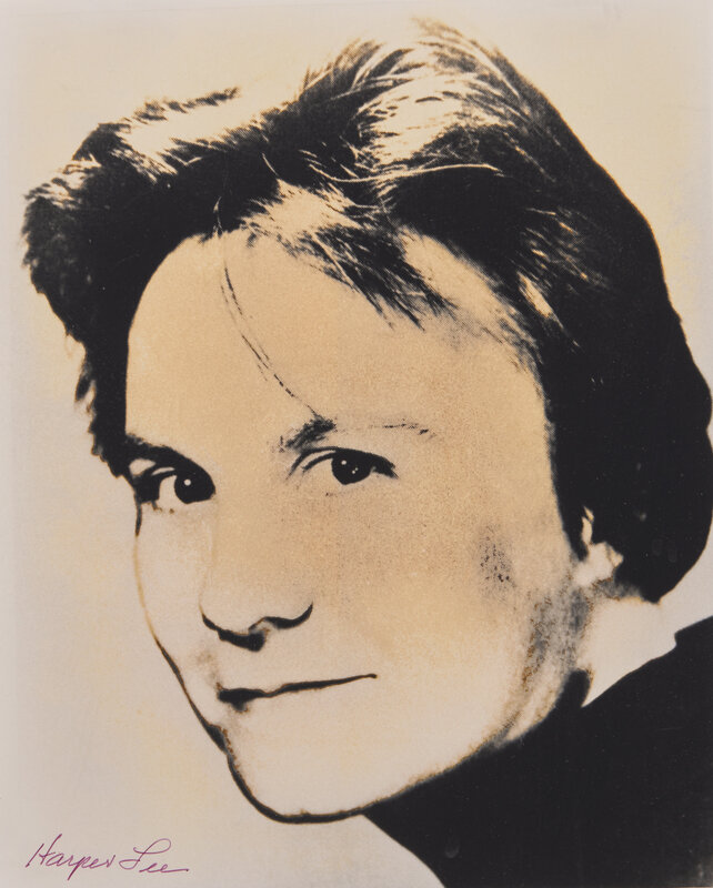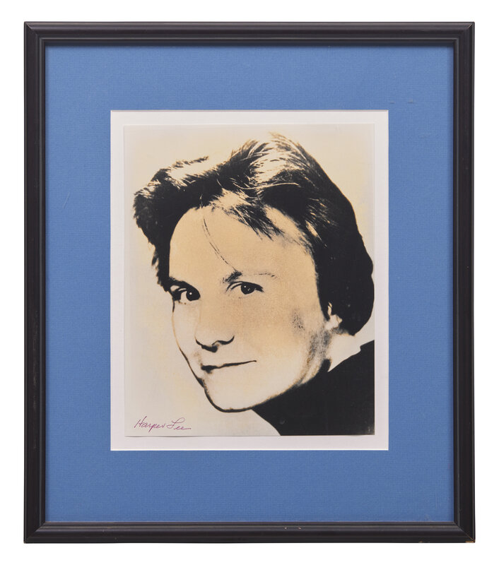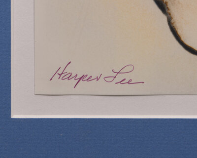 No place, no date. Silver gelatin print of Harper Lee, signed by her in purple ink at bottom left ("Harper Lee"). Approximately 10 x 8 in. (254 x 203 mm) (sight). In mat and in frame, 16 1/2 x 14 1/2 in. (419 x 368 mm).