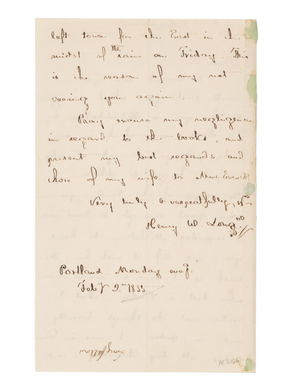 Portland, February 2, 1835. Two pages., 8vo, on recto and verso, old folds, paper transfer along edge.