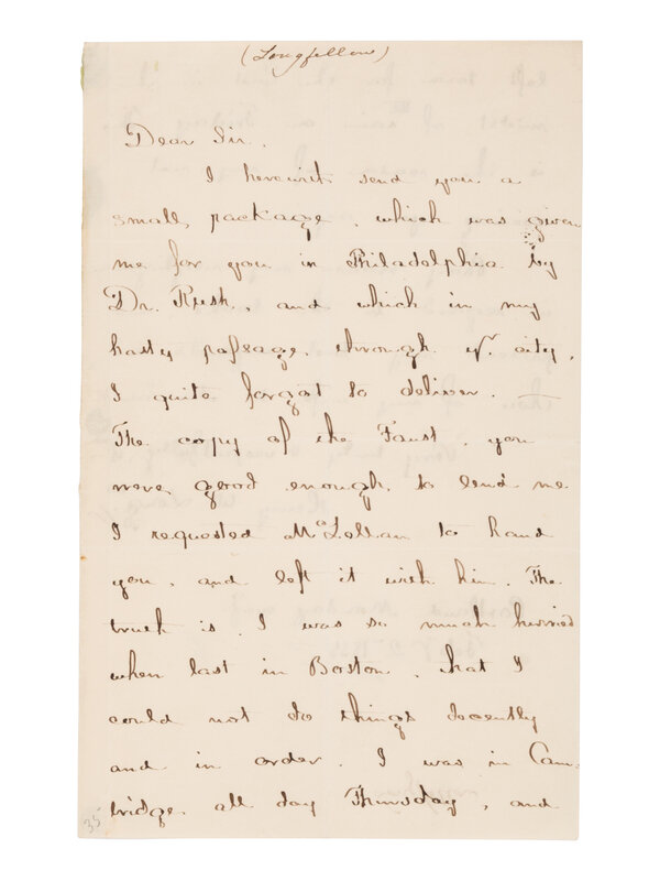 Longfellow sends a package to an unidentified recipient with a copy of Faust that the individual had lent him. Longfellow was interested in German literature and gave lectures on the topic, which included discussions of Goethe's Faust. Some of the translations from Faust were incorporated into Longfellow's poem Hyperion.
