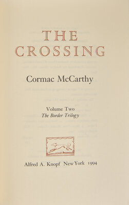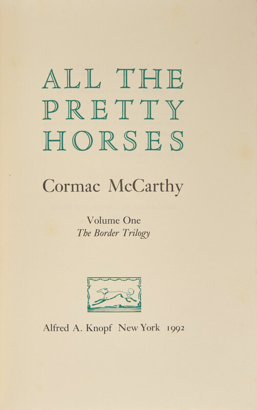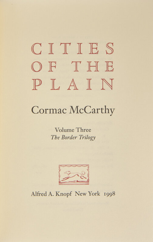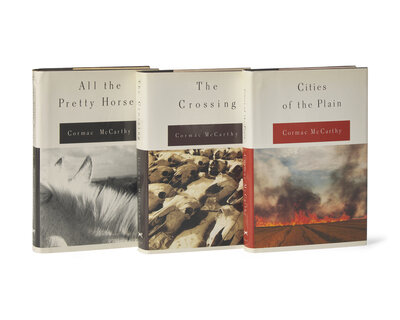 New York: Alfred A. Knopf, 1992-98. In three volumes, comprising: All The Pretty Horses; The Crossing; Cities of the Plain. First editions. 8vo. Publisher's black cloth over black paper-covered boards, stamped in gilt, small stain in upper front board of All the Pretty Horses; in original unclipped pictorial dust-jackets, light scattered spotting and creasing; foxing to text block edges of All the Pretty Horses, foxing to endpapers of same.