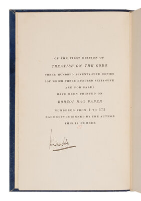 New York and London: Alfred A. Knopf, 1930. First and limited edition, #117/375 copies, signed by Mencken. Large 8vo. Original navy blue cloth gilt, top edge gilt, all others uncut; publisher's dust jacket, some losses along extremities, toning, section of inner bottom flap missing; slipcase faded.