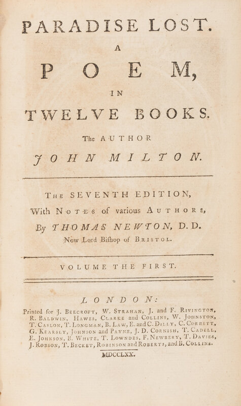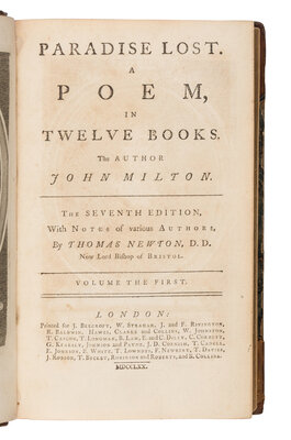 The genesis for Milton's epic poem is believed to have come during the author's boyhood. Following his blindness in 1652 coupled with suffering from gout and then the death of his wife and infant daughter in 1658 Milton began work on the poem in earnest, dictating it to scribes, close friends, and his older daughters. The original 1667 printing was divided into ten books, with the text reorganized into twelve for the 1674 printing.