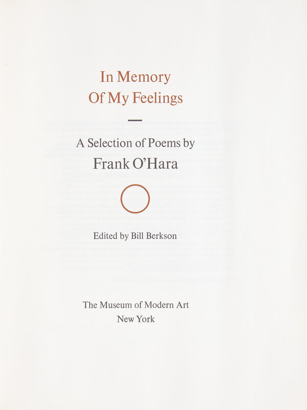 In Memory of My Feelings is a commemorative volume of O'Hara's poems, accompanied by works created by 30 American artists including Jasper Johns, Roy Lichtenstein, Robert Rauschenberg, and many others.