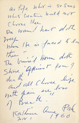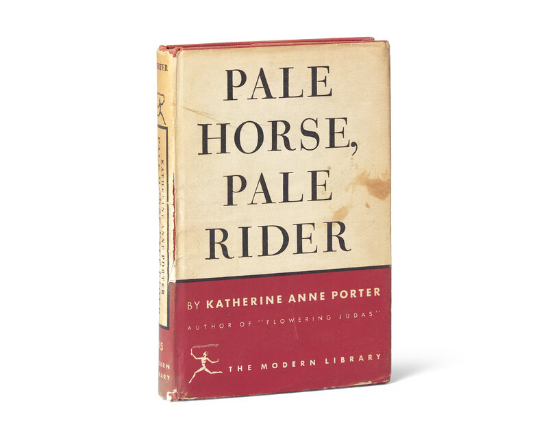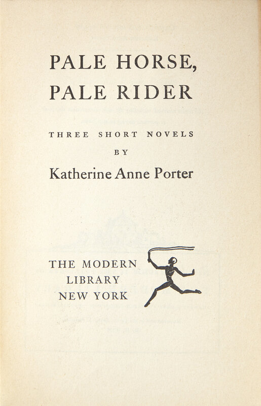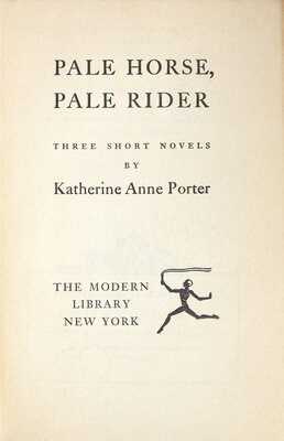 Modern Library edition of Katherine Anne Porter's Pale Horse, Pale Rider, a collection of three short stories, with a lengthy inscription by her of an anonymous seventeenth-century poem titled "As Life What Is So Sweet" on half-title: "'as life what is so sweet / what creature would not / choose thee / the wounded hart doth / weep / when he is forced to lose/ thee-/ The bruised worm doth / strive 'gainst fear of / death / and all choose life / with pain ere loss / of death.' Katherine Anne Porter / Nov 1 1960."