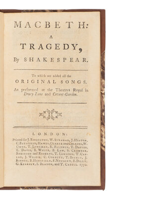 Five works in five volumes, all 8vo, 3 disbound, condition generally good. Including: The Life and Death of Richard III. N.p., n.p., 1709; As you Like it. A Comedy. N.p., n.p., 1709; Poems on Affairs of State, From the Year 1620 to the Year 1707. London: Thomas Tebb and Theoph. Sanders, 1716. Includes "The Rape of Lucrece" and "Venus and Adonis." -- Macbeth: A Tragedy. London: J. Rivington, et al, 1770; Macbeth. A Tragedy. London: C. Bathurst, et al, 1785.