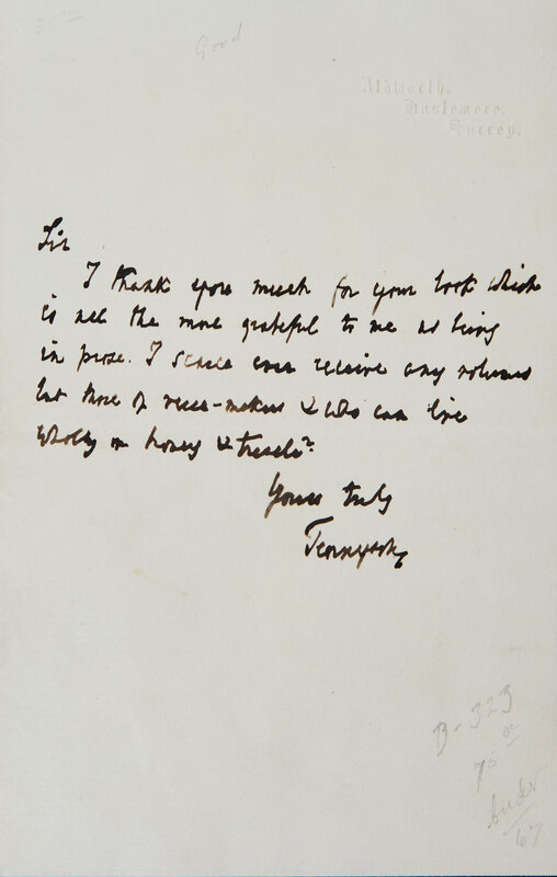 Aldworth, Haslemere, Surrey, no date. One page, 7 x 4 1/4 in. (178 x 108 mm). Autograph letter, signed by Alfred, Lord Tennyson to an unnamed recipient. In full: "Sir I thank you much for your book which is all the more grateful to me as being in prose. I scarce can receive any volumes but those of verse-makers & who can live wholly on honey and treacle? Yours truly Tennyson." Creasing from old folds; black paper border around three edges; lacking integral leaf.