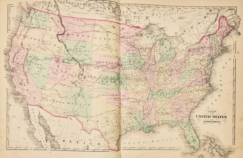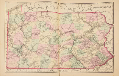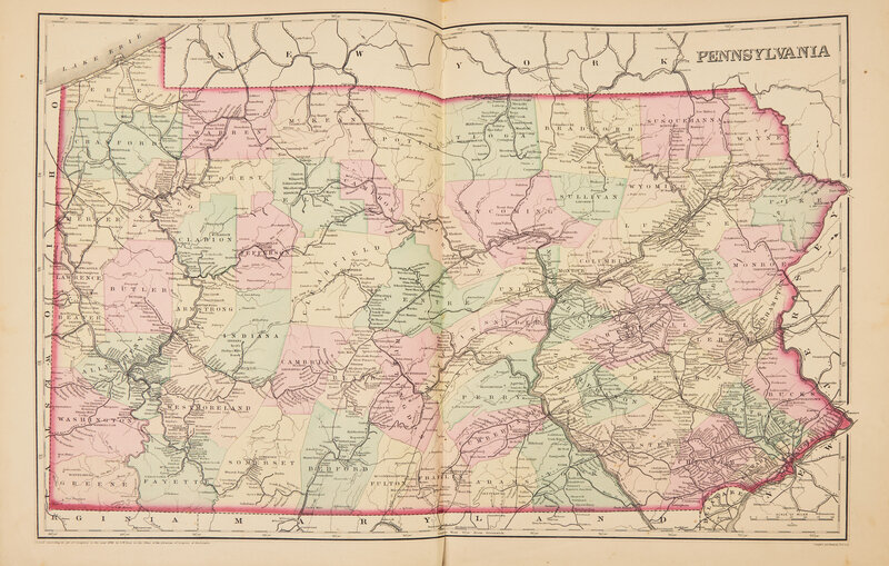 Philadelphia: Everts & Stewart, 1875. Folio. Illustrated with lithographed title-page, hand-colored lithographed double-page maps of the United States and Pennsylvania, 49 full-page hand-colored lithographed maps, four hand-colored double-page lithographed maps, and 46 full and/or double-page uncolored lithographed illustrations. Original three-quarter black morocco over pebbled deep purple cloth-covered boards, decorated in blind and in gilt, boards soiled and rubbed; marbled edges; front hinge reinforced and now splitting; contemporary ownership inscription on front free endpaper ("David H. Mellinger / Cresswell / Lancaster Co. / Pa."), his same inscription on rear free endpaper; scattered spotting to text.