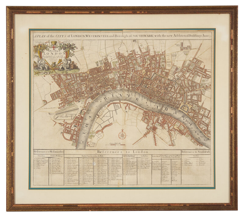 London: John Senex, 1720. Engraved hand-colored map of the city of London; churches, wards, and public buildings listed at bottom. Creasing from old folds, tear along same repaired on verso with archival tape; scattered small tears to margins; light scattered foxing. 20 1/4 x 23 in. (514 x 584 mm). In mat and in frame, 26 1/4 x 30 in. (667 x 762 mm).