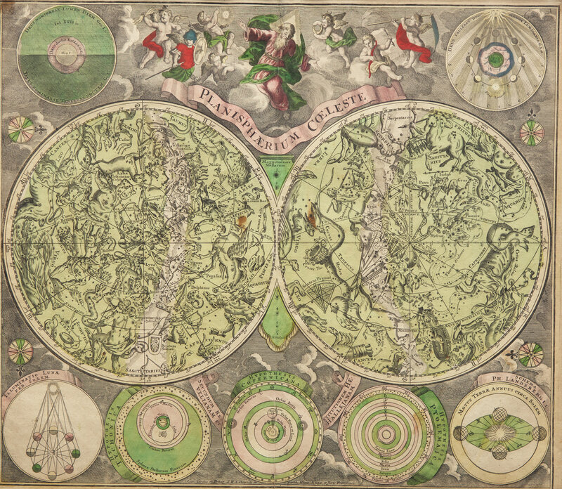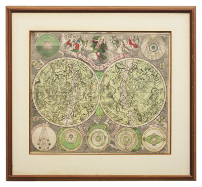(Augsburg, ca. 1730). Hand-colored engraved celestial map. 21 x 24 in. (533 x 610 mm). Repair at bottom central fold verso; scattered soiling. In mat and in frame, 28 1/4 x 30 5/8 in. (717 x 778 mm).