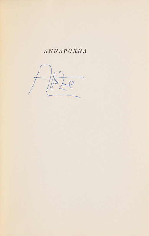 New York: E.P. Dutton & Co., Inc., 1953. Reprint. 8vo. 316 pp. Signed by author Maurice Herzog on half-title. Illustrated with folding map and black and white illustrations. Black and blue cloth, stamped in white; in publisher's fifth printing dust-jacket, price-clipped.