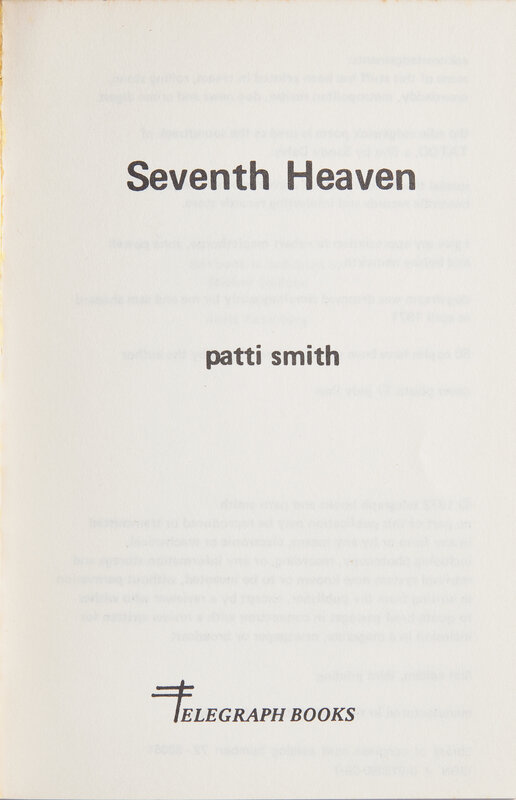 (Boston): Telegraph Books, (1972). First edition, third printing. Signed by Smith in blue ink on front wrapper. 12mo. 47 pp. Original stiff printed pictorial wrappers, cover photograph by Judy Linn, foxing to front and rear wrappers, wrappers unevenly toned.