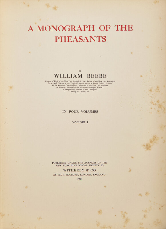 London: Published Under the Auspices of the New York Zoological Society by Witherby & Co., 1918-22. In four volumes. First and limited edition, #257/600 numbered copies. Folio. Title-pages printed in red and in black. Illustrated with 90 lithographed or collotyped color plates, after A. Thorburn, G.E. Lodge, H. Gronvold, L.A. Fuertes, Chas. R. Knight, H. Jones, and E. Megargee (including frontispieces); 88 photogravures after photographs by Beebe; 16 maps printed in red and in black; captioned tissue guards. Publisher's burgundy cloth, stamped in gilt, boards and extremities rubbed; top edges gilt, other edges trimmed; scattered foxing and toning; tissue guard partially stuck to plate LXIII; some tissue guards torn, creased, or loose.
