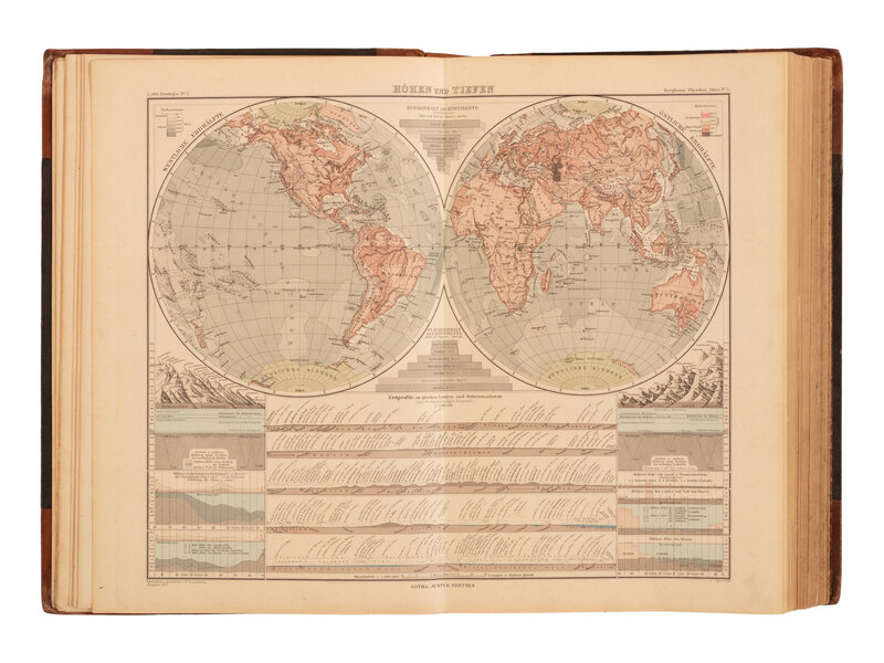 Gotha: Justus Perthes, 1887-1892. 7 parts in one, small folio. 75 lithographed double-page maps, all in color. Contemporary diced calf, gilt-lettered boards, spine in 5 compartments with 4 raised bands, gilt-lettering in 2, upper compartment repaired, old sticker residue near foot, hinges starting; ownership signature.