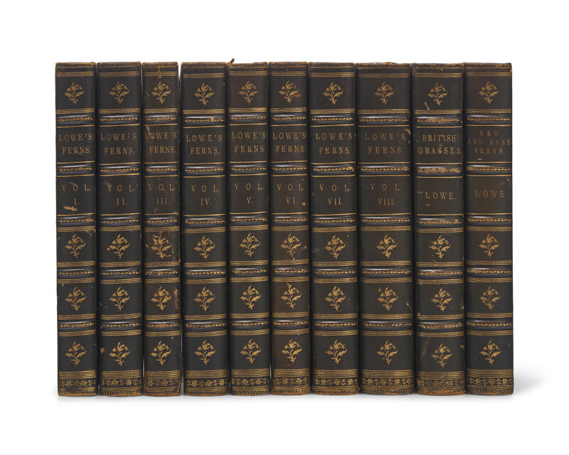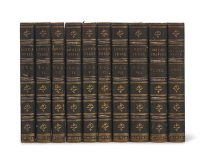 London: Groombridge and Sons, 1868. In eight volumes. 8vo. Illustrated with 479 chromolithographed plates. Three-quarter blue morocco over marbled paper-covered boards, stamped in gilt, rubbing to boards and extremities, lightly worn; all edges gilt; matching marbled endpapers; gift label on front or rear paste-down of each volume; circular library ink stamp at bottom of each title-page; sheets lightly toned; scattered spotting; scattered wear along edges; loss in fore-edge pp. 77-80 and plate XXXIII in Vol. 4.